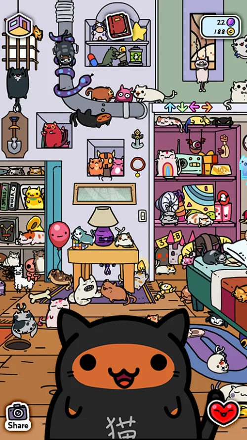 You’ll start with basic cats who venture out into the world and come back with random items to fill your empty space. The variety of collectibles keeps things interesting, ranging from mundane household objects to bizarre artifacts that’ll make you wonder where exactly your cats have been prowling.